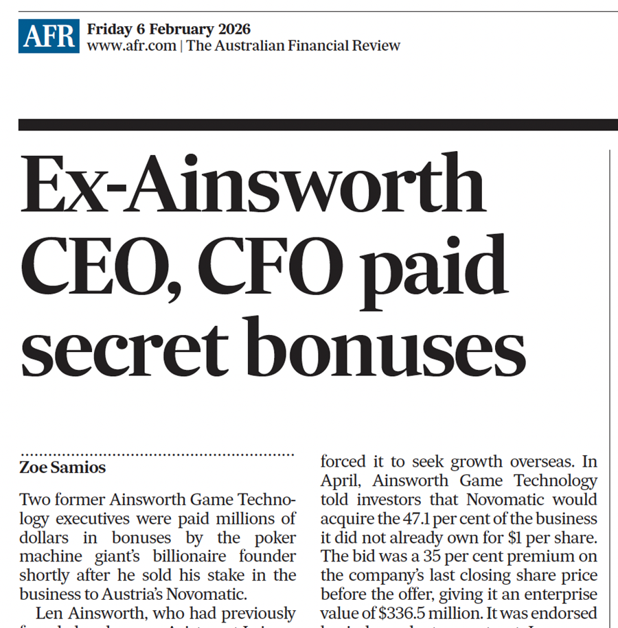 6 February 2026: The AFR is reporting today that ex-Ainsworth CEO, CFO paid secret bonuses